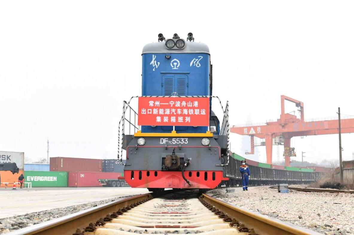 2月8日,在常州站鐵路貨場,裝載新能源汽車的海鐵聯(lián)運(yùn)鐵路班列即將發(fā)車。新華社發(fā)(史康 攝)