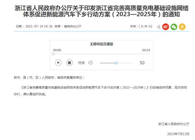 日前,浙江出臺(tái)《浙江省完善高質(zhì)量充電基礎(chǔ)設(shè)施網(wǎng)絡(luò)體系 促進(jìn)新能源汽車下鄉(xiāng)行動(dòng)方案(2023—2025年)》(下稱《行動(dòng)方案》),根據(jù)《行動(dòng)方案》,浙江要打造全省域暢行無(wú)憂、全生命周期服務(wù)管理、全場(chǎng)景豐富多彩的新能源汽車下鄉(xiāng)“浙江模式”。