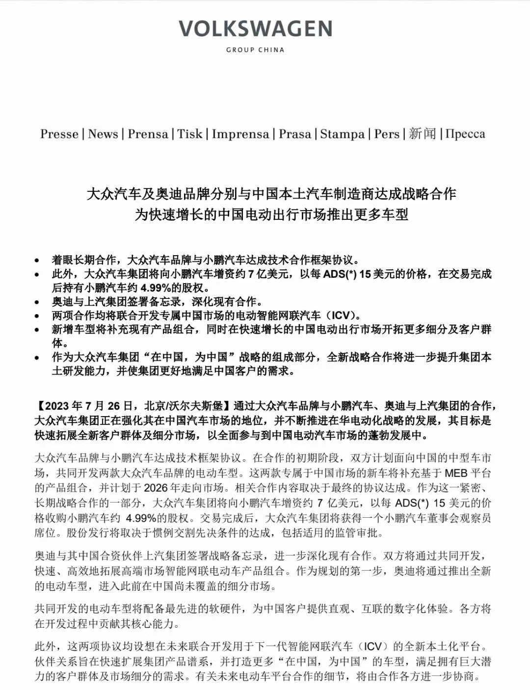 在新車“上市即熱銷”的同時,小鵬還曝出了另一條讓所有人都出乎意料的“大新聞”——7月26日,該品牌與大眾汽車同時宣布:雙方已達(dá)成技術(shù)框架協(xié)議,將面向中國的中型車市場,共同開發(fā)兩款大眾汽車品牌的電動車型,并計劃于2026年推向市場。