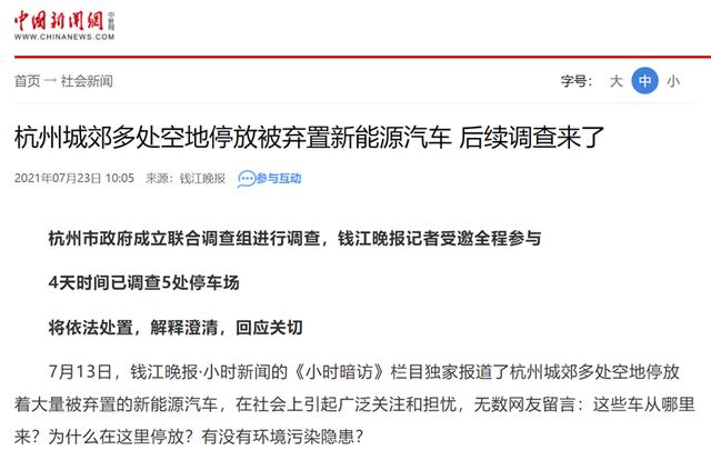 2021年7月,《錢江晚報(bào)·小時(shí)新聞》的《小時(shí)暗訪》欄目報(bào)道了杭州城郊多處空地停放大量新能源汽車一事。杭州市政府旋即部署了由市交通運(yùn)輸局(管理中心、執(zhí)法隊(duì))、市公安局(交通治安分局、交警支隊(duì))牽頭的聯(lián)合調(diào)查小組,摸排在城市郊區(qū)集中停放的新能源汽車情況。