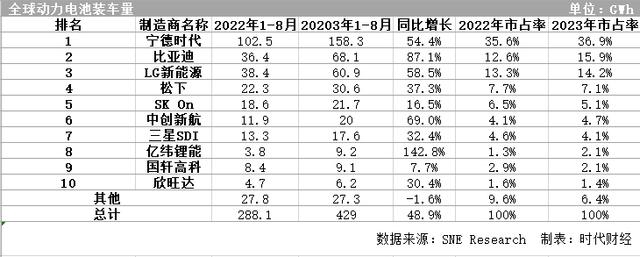 根據(jù)市場研究機構SNE Research公布的全球動力電池裝車數(shù)據(jù)。2023年1—8月,全球動力電池裝車量為429GWH,同比增長48.9%。中國六家電池企業(yè)入名前十,整體市占率63.1%,較去年同期的58.1%增加5個百分點。