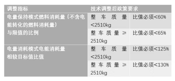 除純電新能源車之外,對(duì)于銷量同樣火爆的插電式混合動(dòng)力(含增程式)乘用車,《技術(shù)要求公告》也上調(diào)了技術(shù)指標(biāo)。如下圖所示: