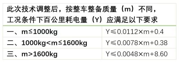 第三個(gè)指標(biāo)為“按整車整備質(zhì)量(m)不同,工況條件下百公里耗電量(Y)應(yīng)滿足要求”,此次技術(shù)調(diào)整將該指標(biāo)分為三種詳細(xì)情況: