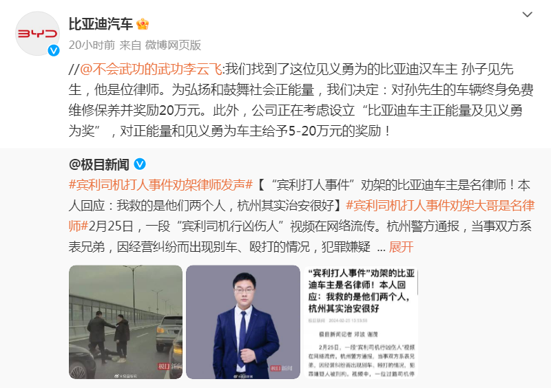 25日下午,比亞迪集團(tuán)品牌及公關(guān)處總經(jīng)理李云飛在微博表示,已找到這位見義勇為的比亞迪漢車主孫子見,他是位律師。比亞迪決定,對孫先生的車輛終身免費(fèi)維修保養(yǎng),并獎勵20萬元。