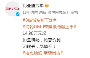 2月29日,比亞迪再出“王炸”。當(dāng)天,比亞迪汽車發(fā)布微博稱,宋PLUS DM-i榮耀版12.98萬—16.98萬元;宋PLUS EV榮耀版14.98萬—18.98萬元。同時(shí),比亞迪還推出B級(jí)轎車“新王炸”——海豹DM-i榮耀版勁爆上市,14.98萬元起。