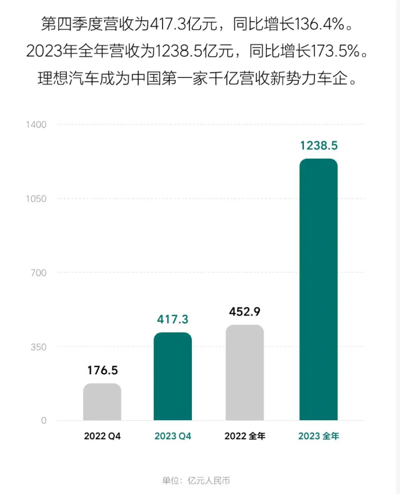 財(cái)報(bào)顯示,理想汽車2023年全年實(shí)現(xiàn)營收1238.5億元,同比增長173.5%,為國內(nèi)首家營收突破千億元的新勢力車企。2023年凈利潤為118.1億元,而2022年凈虧損20.3億元,實(shí)現(xiàn)了自交付以來的全面盈利,成為繼特斯拉、比亞迪之后全球第三家實(shí)現(xiàn)盈利的新能源車企。其中,2023年四季度凈利潤為57.5億元,同比增長2068.2%。
