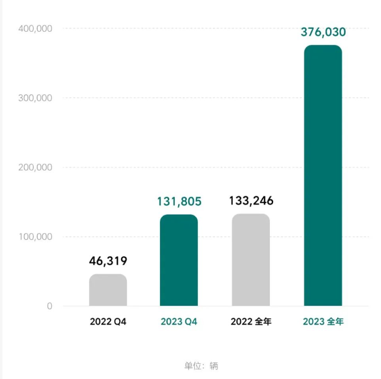 理想汽車扭虧為盈的背后是交付量的強(qiáng)勁增長。2023年,理想汽車交付新車37.6萬輛,同比增長182.2%,超額完成年度30萬輛的交付目標(biāo),奪得2023年新勢力“銷冠”。其中,四季度交付13.18萬輛,同比增長184.6%,超此前交付指引。