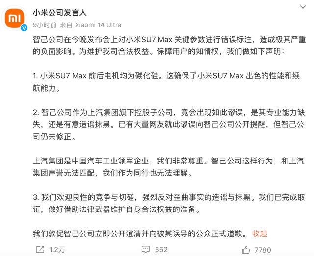 約半小時(shí)后,智己汽車終于在官方微博作出回應(yīng)稱,在剛剛結(jié)束的智己L6超級(jí)智能轎車發(fā)布會(huì)過(guò)程中,對(duì)標(biāo)近期同級(jí)流量熱議的小米SU7產(chǎn)品力介紹過(guò)程中,由于團(tuán)隊(duì)內(nèi)容審核疏漏,造成一處關(guān)鍵參數(shù)的錯(cuò)誤標(biāo)注,澄清如下:小米SU7 Max版前后電機(jī)均采用SIC碳化硅模塊,與智己L6所采用的技術(shù)一致,均為行業(yè)頂尖的技術(shù)標(biāo)準(zhǔn),“小米汽車及旗下產(chǎn)品SU7,是我們尊敬的競(jìng)爭(zhēng)隊(duì)友!由于內(nèi)審出現(xiàn)疏漏,造成對(duì)小米汽車的負(fù)面影響,我們深表歉意,也向所有粉絲、用戶們誠(chéng)摯致歉!”