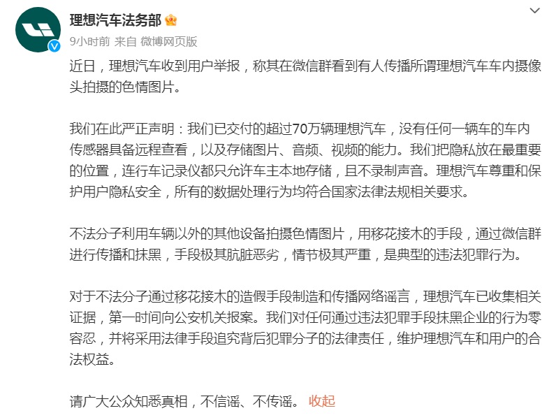 4月15日,@理想汽車法務(wù)部 發(fā)文稱,近日收到用戶舉報(bào),稱其在微信群看到有人傳播所謂理想汽車車內(nèi)攝像頭拍攝的色情圖片。