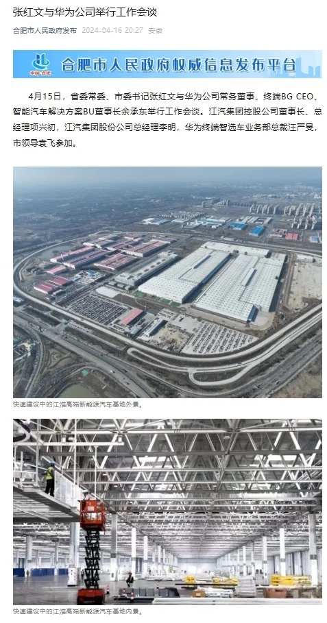 2023年12月,江淮汽車發(fā)布公告稱,與華為終端有限公司簽署《智能新能源汽車合作協(xié)議》。雙方將基于華為智能汽車解決方案,在產(chǎn)品開發(fā)、生產(chǎn)制造、銷售、服務等多個領(lǐng)域全面合作,著力打造豪華智能網(wǎng)聯(lián)電動汽車。