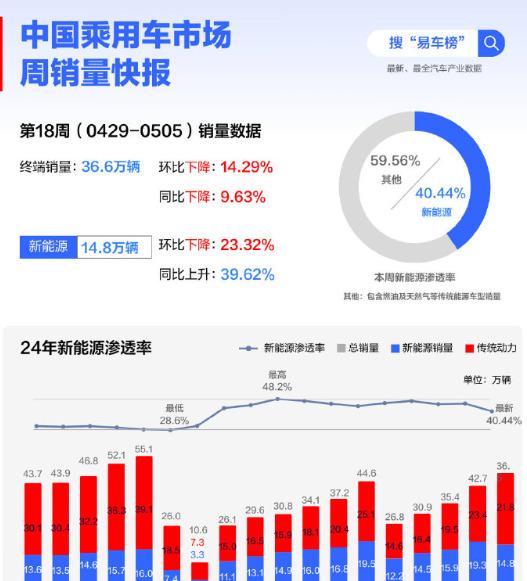 深入到2024年第18周的銷售細(xì)節(jié),即4月29日至5月5日這一時間段,我們發(fā)現(xiàn)中國汽車市場整體銷量為36.6萬輛,相較之前呈現(xiàn)出一定的下滑趨勢。其中,新能源汽車的銷量為14.8萬輛,盡管與去年同期相比仍實現(xiàn)了近40%的顯著增長,但與之前幾周相比,卻出現(xiàn)了環(huán)比下滑的態(tài)勢。基于這些數(shù)據(jù),我們可以清晰地看到,該周新能源汽車在中國市場的滲透率為40.44%。