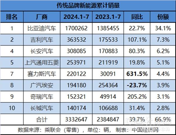 從前7個月的累計銷量來看,傳統(tǒng)新能源車企還是維持原有格局,入圍前十榜單的8家品牌的合計銷量超過333萬輛,同比增長39.7%,在新能源乘用車總銷量中的占比近七成。
