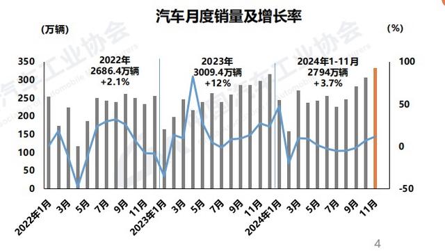 中汽協(xié)數(shù)據(jù)顯示,1~11月,我國汽車產(chǎn)銷分別完成2790.3萬輛和2794萬輛,同比分別增長2.9%和3.7%,汽車產(chǎn)量增速較1~10月擴(kuò)大1.1個(gè)百分點(diǎn),銷量增速擴(kuò)大1個(gè)百分點(diǎn)。