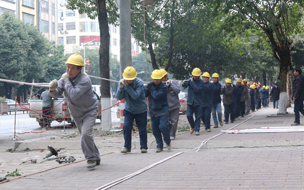 日前,在湖南省永州市寧遠(yuǎn)縣城區(qū)舜帝北路段,筆者看到,電力工人們正在忙碌地架設(shè)10KV 逍水線延伸線。