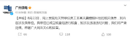 22日晚,@廣州供電 發(fā)布聲明:8月22日,網上發(fā)現(xiàn)有關我單位員工王某夫妻婚姻糾紛的相關信息,其內容涉及我單位。我單位已成立核查組進行核查,如涉及違法違紀問題,我們將嚴肅處理。感謝廣大網友關心和監(jiān)督。