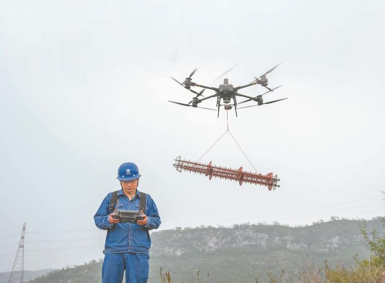 柔性攻關(guān)創(chuàng)新團(tuán)隊(duì)成員應(yīng)用改造后的重載無(wú)人機(jī)將合成絕緣子串送至220千伏梁柏Ⅰ線檢修現(xiàn)場(chǎng)。
