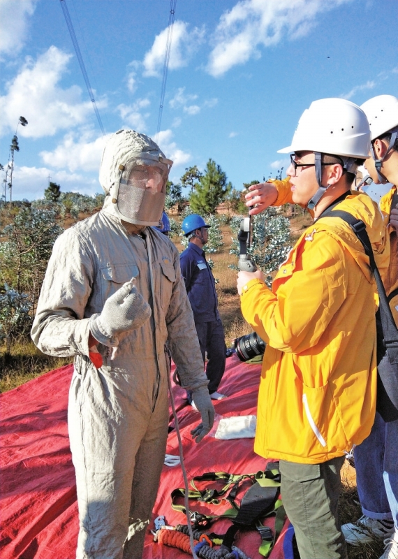 在±800千伏楚穗直流線路2號塔,當(dāng)超高壓公司昆明局輸電管理所帶電班班長張曉輝向大家展示他的特高壓帶電作業(yè)屏蔽服時,武漢大學(xué)大四學(xué)生喬曉亮忍不住試穿了一把。穿上屏蔽服,開始喬曉亮覺得新鮮,但沿著高壓線路在地面走了不到十分鐘,額頭上立即冒出汗珠,“當(dāng)架空輸電線路上出現(xiàn)故障時,帶電作業(yè)人員就需要穿著這樣的服裝背著三四十斤的工具,走在70多米的高塔上帶電作業(yè),聽起來不可思議,但這就是南網(wǎng)員工的日常。”喬曉亮說。