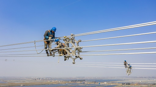 國(guó)網(wǎng)江蘇電力員工在線路上安裝間隔棒。