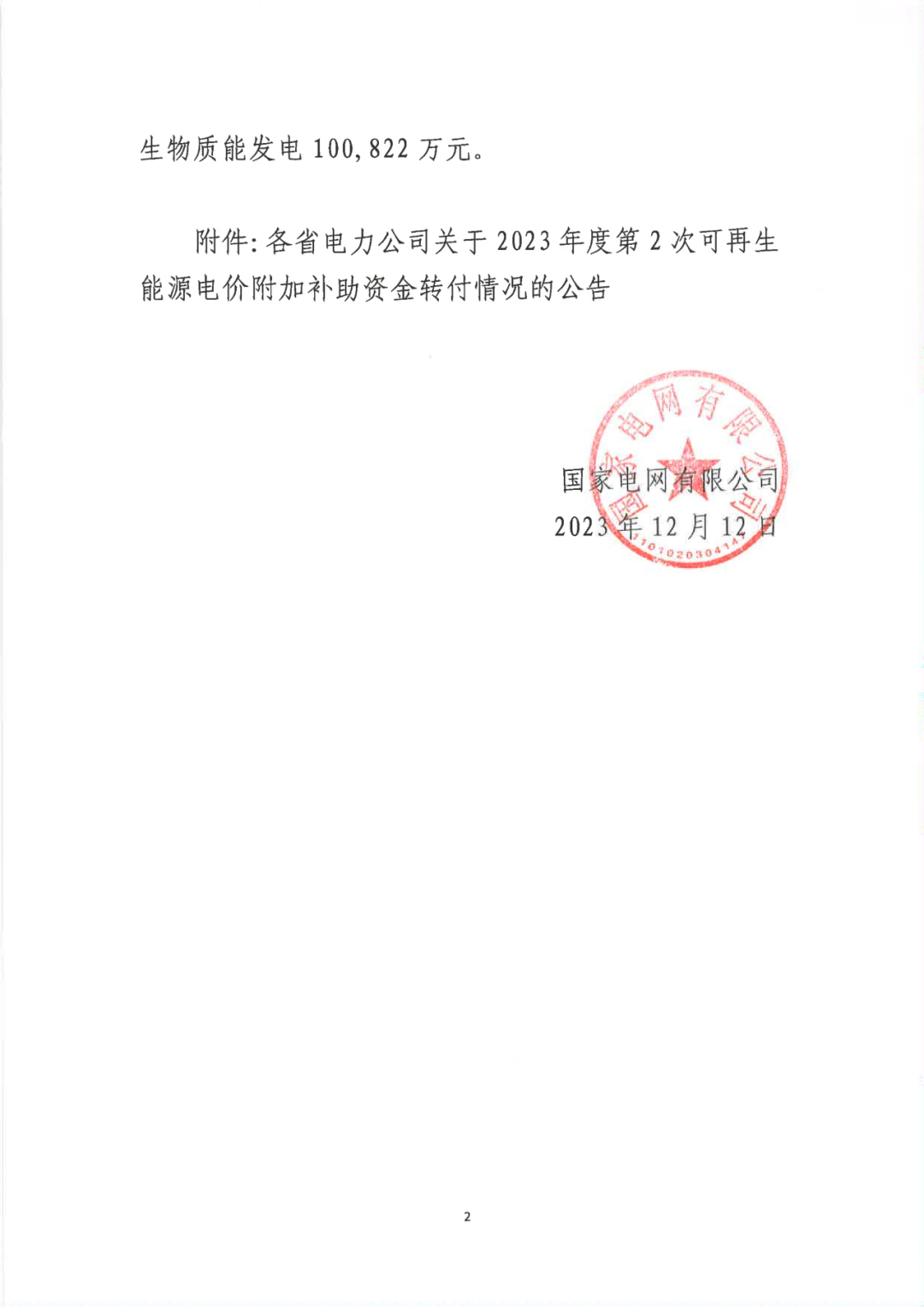 原文如下:按照《財政部 國家發(fā)展改革委 國家能源局關(guān)于印發(fā)<可再生能源電價附加資金管理辦法>的通知》(財建〔2020〕5號)文件要求,國家電網(wǎng)有限公司(以下簡稱“公司”)將2023年第2次可再生能源電價附加補助資金的撥付原則和順序等相關(guān)情況公告如下:一、補助資金撥付原則和順序公司嚴(yán)格按照財政部《關(guān)于調(diào)劑2023年可再生能源電價附加補助資金預(yù)算的通知》(財資〔2023〕93號)中明確的補貼資金撥付原則和順序,在收到財政部撥付款項后,對納入補貼目錄或清單且滿足結(jié)算條件的各類項目進(jìn)行及時、足額轉(zhuǎn)付。具體情況見各省電力公司公告。二、2023年第2次補助資金情況2023年11月,財政部下達(dá)公司可再生能源電價附加補助資金年度預(yù)算2,550,000萬元,其中:風(fēng)力發(fā)電1,224,013萬元,太陽能發(fā)電1,225,165萬元,生物質(zhì)能發(fā)電100,822萬元。