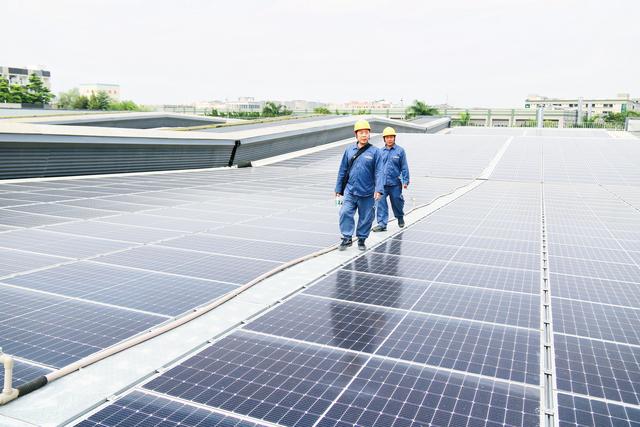 南方電網(wǎng)廣東東莞供電局工作人員為企業(yè)新裝的光伏發(fā)電項目服務(wù),助力企業(yè)綠色低碳發(fā)展。鐘肖如 攝