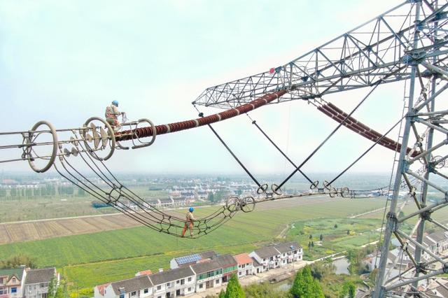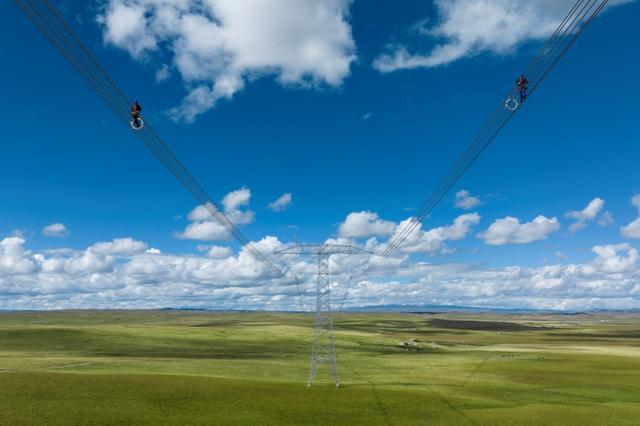 國網(wǎng)青海電力員工在青豫特高壓輸電線路開展走線作業(yè)。