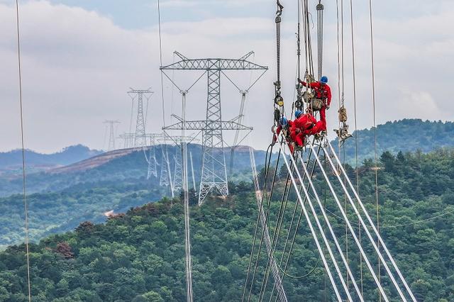 國網(wǎng)甘肅電力施工人員在哈密—重慶±800千伏特高壓直流輸電工程開展架線自檢。