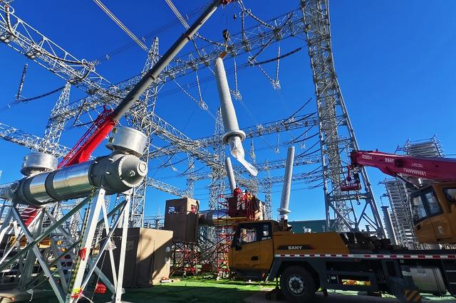 國網(wǎng)河北建設(shè)公司施工人員在雄安(北京西)1000千伏特高壓變電站擴(kuò)建工程安裝套管設(shè)備。
