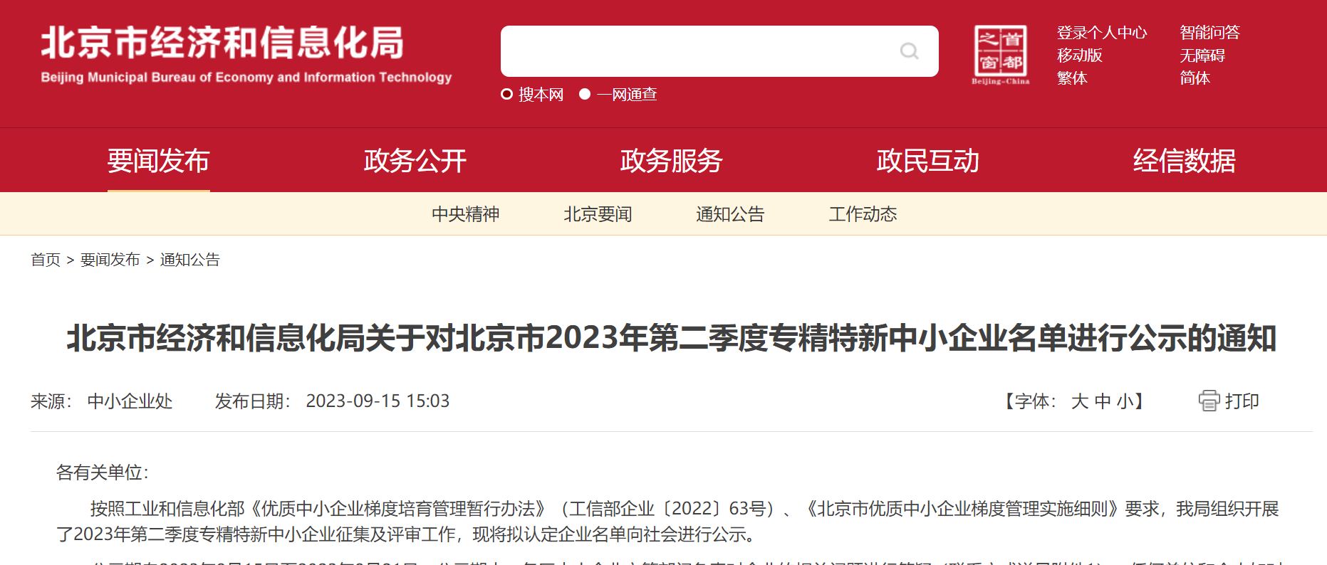 中國(guó)電力網(wǎng)訊(通訊員 時(shí)君柳) 9月15日,北京市經(jīng)濟(jì)和信息化局公布了《關(guān)于對(duì)北京市2023年第二季度“專精特新”中小企業(yè)名單進(jìn)行公示的通知》,國(guó)網(wǎng)信通產(chǎn)業(yè)集團(tuán)國(guó)電通憑借行業(yè)專業(yè)化、技術(shù)創(chuàng)新力、服務(wù)精細(xì)化從眾多參選企業(yè)中脫穎而出,獲得2023年度北京市“專精特新”中小企業(yè)榮譽(yù)稱號(hào)。