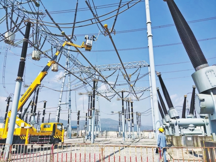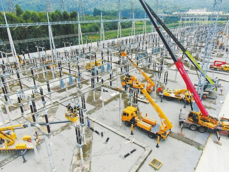 工作人員對220千伏草鋪?zhàn)冸娬倦[患母線進(jìn)行更換。 盧顯侖 攝