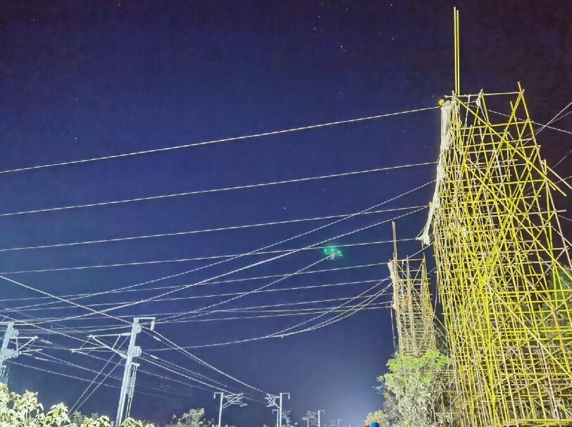 當晚0時0分,六旋翼無人機從武西高鐵南側(cè)起飛,牽引著迪尼瑪繩向北側(cè)飛去,地面作業(yè)人員順著無人機的牽拉力量緩緩放繩。鐵路軌道處監(jiān)護人員密切觀測著各級引繩與跨越架之間的距離,通過對講機通知牽張場及時調(diào)整牽張力,確保架線施工順利進行。