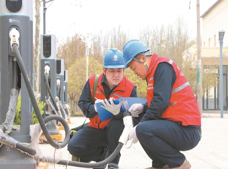 “紅馬甲”網(wǎng)格員檢查充電樁設(shè)備,服務(wù)綠色出行。