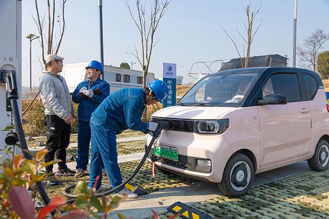 國網(wǎng)馬鞍山供電公司員工在和縣善厚鎮(zhèn)半月湖電動(dòng)汽車充電站為車主解答充電疑問。高孫浩攝