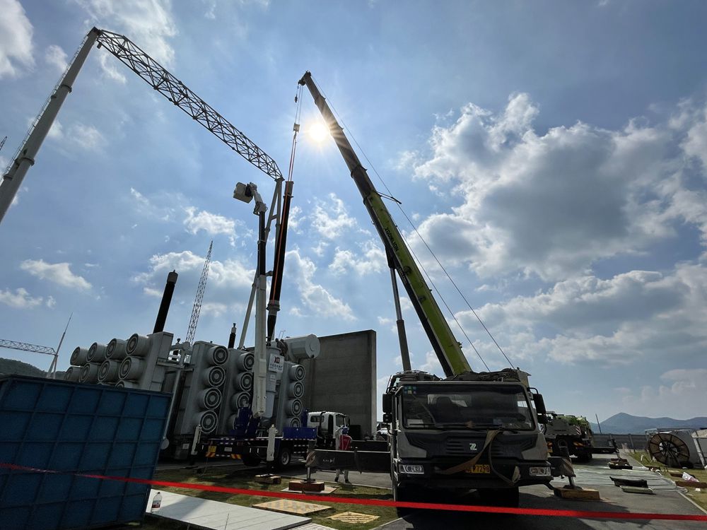 值得一提的是,高中壓套管拉桿更換是此次大修工作的重點,高達(dá)14.2米的套管需要兩輛吊車配合吊裝,吊裝工作尤為重要。“變壓器本體排油完成,可以開始吊裝工作!”現(xiàn)場工作人員使用套管安裝專用吊具小心翼翼地將拉桿式結(jié)構(gòu)套管垂直起吊,并在吊裝區(qū)的四個方向均設(shè)置專人監(jiān)護(hù),隨時注意吊裝情況。套管落地后,工作人員隨即有序開展瓷瓶探傷、拉桿和紫銅底座的檢查和更換各項工作,現(xiàn)場有條不紊,各方人員團(tuán)結(jié)一致,力爭縮短變壓器器身暴露空氣時間,嚴(yán)格按照相關(guān)工藝要求進(jìn)行檢查、記錄數(shù)據(jù),最后成功在計劃時間內(nèi)完成套管復(fù)裝。