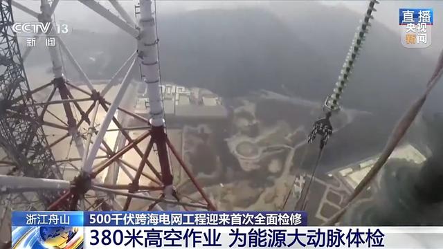 總臺記者 于晨:我現(xiàn)在所在的位置就是全線四個架空大跨越線路中規(guī)模最大的一條,位于舟山金塘島一側(cè)的西堠門大跨越的輸電高塔上,整個塔高380米,一百二三十層樓高,我們從塔底爬到塔頂就花費了1個多小時。它是目前世界跨海最高的輸電鐵塔,從金塘島到對岸的冊子島,共有兩座這樣380米高的輸電鐵塔。