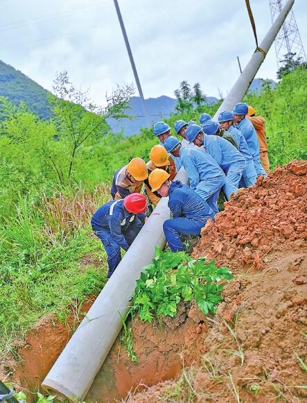 7月13日,在百色市德??h城關(guān)鎮(zhèn)云梯村足斗屯電網(wǎng)改造現(xiàn)場(chǎng),施工人員合力把電桿移進(jìn)桿坑里。 冉袖言 攝