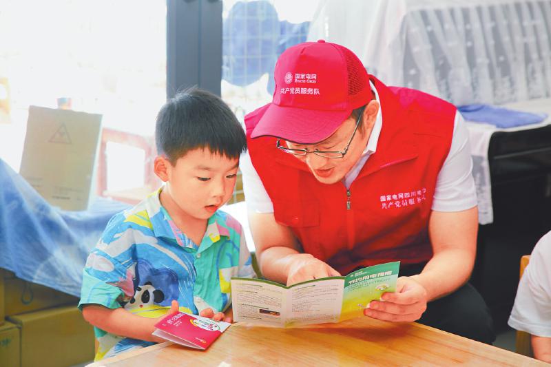 在四川廣安,國網(wǎng)四川電力共產(chǎn)黨員服務(wù)隊(duì)隊(duì)員走進(jìn)幼兒園,宣傳節(jié)約用電。王西米 攝