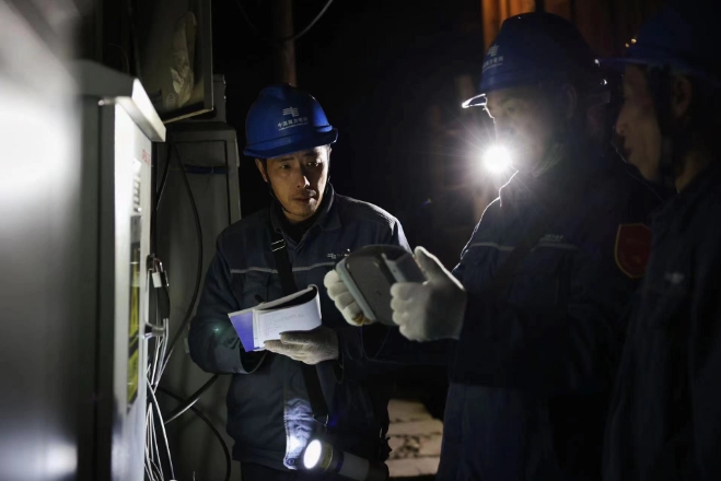 工作人員對“村晚”主要場所供電線路設(shè)備進(jìn)行巡視(央廣網(wǎng)發(fā) 陸雯 攝)