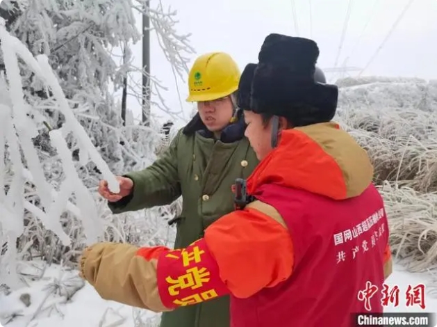 晉電援湘抗冰突擊隊(duì)隊(duì)員正在查看湖南電網(wǎng)線路周邊覆冰情況。國網(wǎng)山西省電力公司供圖