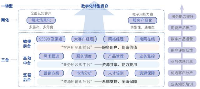 以“三臺兩化一轉(zhuǎn)型”為抓手,全面推進現(xiàn)代供電服務體系建設(shè),不斷優(yōu)化前、中、后臺協(xié)同運作機制,暢通企業(yè)內(nèi)循環(huán)。實體化中臺建設(shè)穩(wěn)步推進,“基礎(chǔ)+增值”用電服務產(chǎn)品不斷豐富,服務效率不斷提升、用戶獲得感、幸福感和安全感不斷增強。