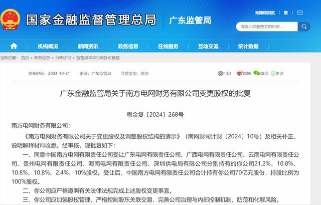 近日,廣東金融監(jiān)管局公布相關(guān)批復(fù),同意中國南方電網(wǎng)有限責(zé)任公司(簡稱:南方電網(wǎng))受讓廣東電網(wǎng)有限責(zé)任公司、廣西電網(wǎng)有限責(zé)任公司、云南電網(wǎng)有限責(zé)任公司、貴州電網(wǎng)有限責(zé)任公司、海南電網(wǎng)有限責(zé)任公司、深圳供電局有限公司分別持有的南方電網(wǎng)財(cái)務(wù)有限公司(簡稱:南方電網(wǎng)財(cái)務(wù)公司)21.2%、10.8%、10.8%、10.8%、2.4%、10%股權(quán)。受讓后,南方電網(wǎng)合計(jì)持有南方電網(wǎng)財(cái)務(wù)公司70億元股份,持股比例為100%股權(quán)。以下是相關(guān)批復(fù)正文: