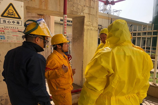 在監(jiān)護(hù)人員的指導(dǎo)下,各演練人員通過實戰(zhàn)演練對酸儲罐泄漏的處理有了更直觀的認(rèn)識,并熟悉了防護(hù)用品的穿戴要求,能夠按照演練要求進(jìn)行相關(guān)操作。演練結(jié)束后化學(xué)專工高淵、馬潔和發(fā)電部副部長孫偉迪對本次演練進(jìn)行評價,并提出了整改意見。
