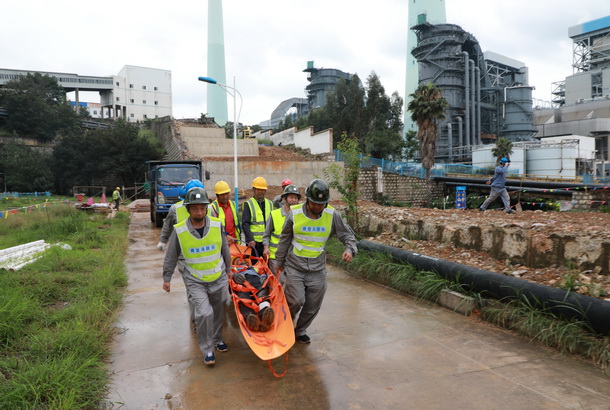 演練在該公司北廠區(qū)路邊山坡冷卻塔周邊正在施工的的五號擋墻展開,因為修補循環(huán)水施工,該處山體裸露,坡體較高。災情設定為因多日降雨造成路邊山坡發(fā)生山體滑坡泥石流災害,一人受傷,情況十分危急。演練按照發(fā)現險情、疏散轉移、搶險救援、醫(yī)療救治4個環(huán)節(jié)進行,每個環(huán)節(jié)銜接緊密,應急反應快速到位,緊急救援有條不紊,人員撤離井然有序,演練人員緊密配合,現場緊張有序,圓滿完成了演練任務。