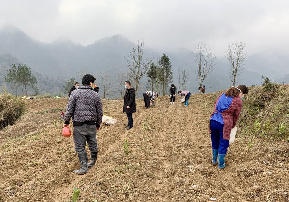 然而在村里的油茶種植基地里卻是另外一番場景,幾輛拖拉機來往運送土豆種子,二十幾個村民戴著口罩在地里忙碌著,整地、挖坑、選種、澆水、施肥,一幅生機勃勃的景象。