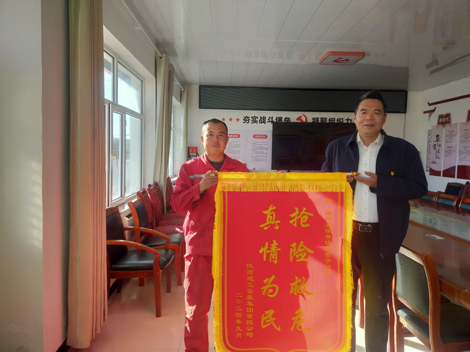 圖為陜西建工安裝集團負(fù)責(zé)人到大營子村送錦旗