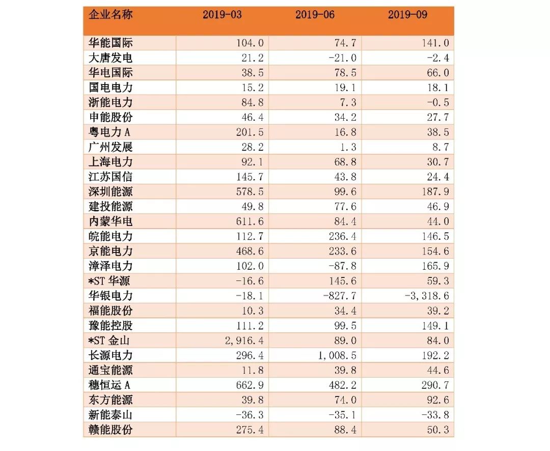 2019年三季度,電力行業(yè)74家上市公司中,實現(xiàn)歸母凈利潤同比正向增長的有31家,有3家(分別為:漳澤電力(2.380, 0.00, 0.00%)、*ST凱迪(1.050, 0.00, 0.00%)(維權(quán))、太陽能(3.380, -0.01, -0.29%))公司扭虧為盈。
