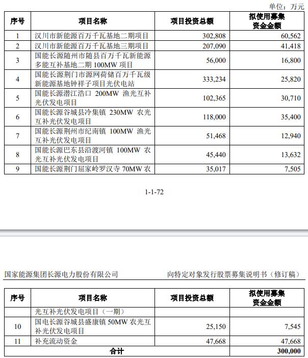 長源電力向特定對象發(fā)行股票募集說明書(修訂稿)(2023年三季度財務數(shù)據(jù)更新版)顯示,本次發(fā)行股票募集資金總額不超過300,000萬元(含本數(shù)),扣除發(fā)行費用后的募集資金凈額將用于漢川市新能源百萬千瓦基地二期項目、漢川市新能源百萬千瓦基地三期項目、國能長源隨州市隨縣百萬千瓦新能源多能互補基地二期100MW項目、國能長源荊門市源網(wǎng)荷儲百萬千瓦級新能源基地鐘祥子項目光伏電站、國能長源潛江浩口200MW漁光互補光伏發(fā)電項目、國能長源谷城縣冷集鎮(zhèn)230MW農(nóng)光互補光伏發(fā)電項目、國能長源荊州市紀南鎮(zhèn)100MW漁光互補光伏發(fā)電項目、國能長源巴東縣沿渡河鎮(zhèn)100MW農(nóng)光互補光伏發(fā)電項目、國能長源荊門屈家?guī)X羅漢寺70MW農(nóng)光互補光伏發(fā)電項目(一期)、國電長源谷城縣盛康鎮(zhèn)50MW農(nóng)光互補光伏發(fā)電項目、補充流動資金。