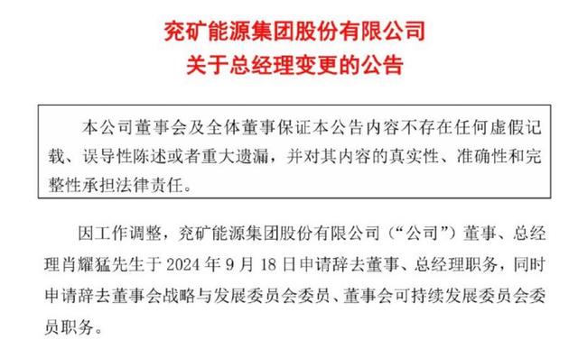 9月18日晚,兗礦能源(600188.SH)公告,因工作調(diào)整,公司董事、總經(jīng)理肖耀猛當(dāng)天申請(qǐng)辭去董事、總經(jīng)理職務(wù),同時(shí)辭去董事會(huì)戰(zhàn)略與發(fā)展委員會(huì)委員、董事會(huì)可持續(xù)發(fā)展委員會(huì)委員職務(wù)。