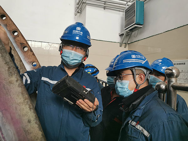 張博(左一)為青年職工講解轉(zhuǎn)輪支架縫隙測(cè)試儀使用方法