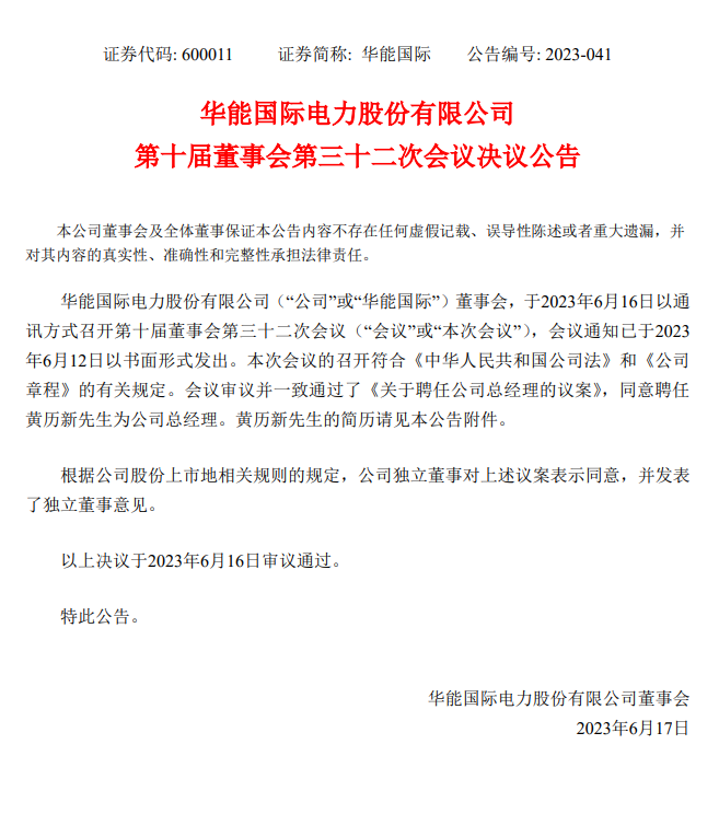 2022年9月26日,華能國際原總經(jīng)理趙平先生因年齡原因辭職。華能國際公告稱,在華能國際聘任新任總經(jīng)理前,由華能國際董事長趙克宇先生代行總經(jīng)理職責。時隔9個月,華能國際總經(jīng)理一職終于迎來新人選!2023年6月16日,華能國際召開董事會,審議并一致通過了《關(guān)于聘任公司總經(jīng)理的議案》,同意聘任黃歷新先生為公司總經(jīng)理。