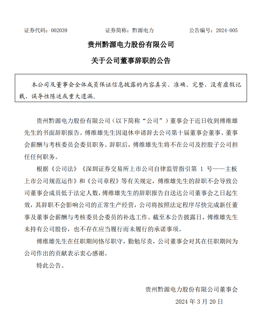 傅維雄辭去貴州黔源電力股份有限公司(以下簡(jiǎn)稱“黔源電力”)董事等職務(wù)。